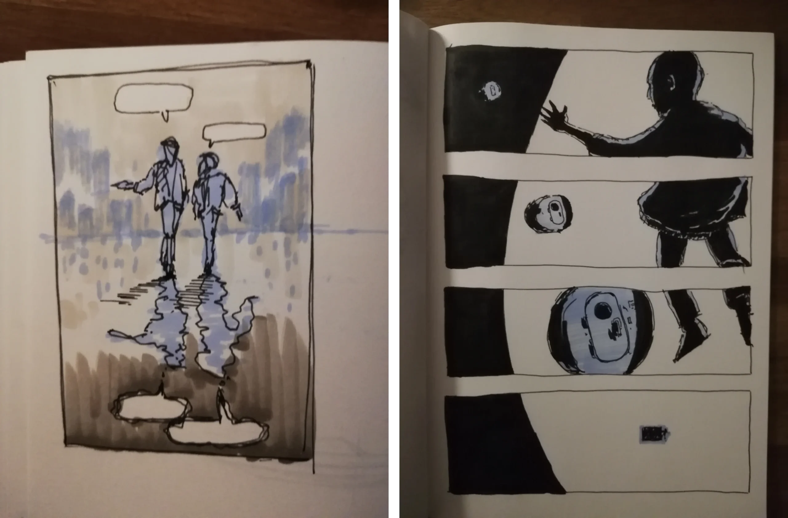 How do you approach your sketchbooks and what you like to draw? I also loved the time lapse videos of you sketching out the artwork for your new release too. Is taking into digital a recent thing you’ve been exploring? Thank you! While I do draw digitally on an iPad with procreate for client work or my record cover, I mainly use drawing to get away from screens. So it’s back to just pen and paper. I started in the beginning of last year to reduce screen time to a minimum which turned out to be the most effective ADHD treatment after medication and caring for a dog. So much so that recently I got re-evaluated and lost the H and advanced to ADD. I do keep a journal and will also doodle all over it. Sometimes when watching a movie I will pause on a frame I like and take a quick sketch. Or do character studies, frame layouts or story boards for that comic I had in mind. Practicing inking with a brush or nib to get the muscle memory back.
